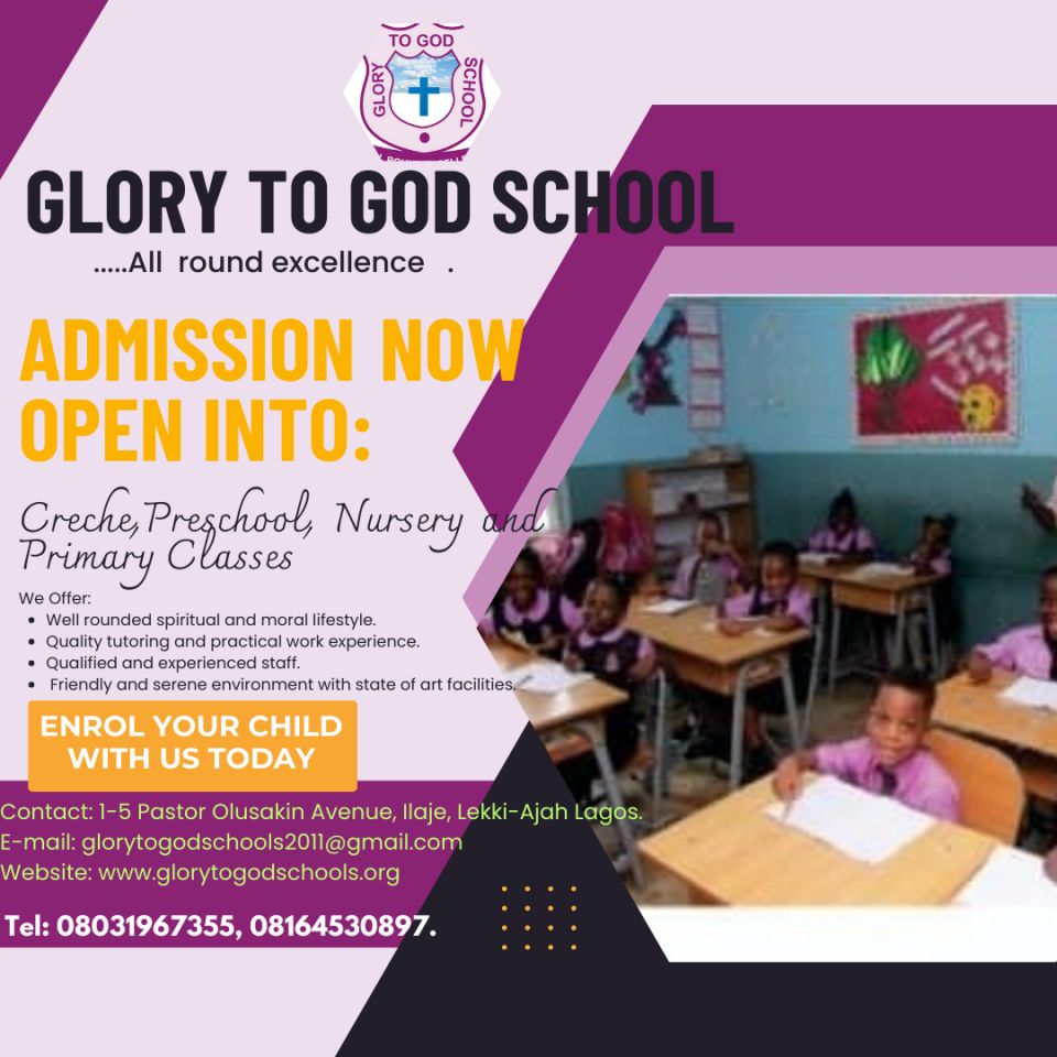 Glory to God Nursery and Primary School located at Plot 1-5 Pastor Olu Olusakin Avenue, Alaguntan, Ilaje Bus Stop, Lekki-Ajah Express way, Lagos started in 2011 with a mandate to provide a safe and conducive learning environment with adequate and efficient personnel to make learning more appealing. Glory to God Nursery and Primary School has evolved as a benchmark institution which offers continuity of education and development for children in a happy, safe, friendly and responsive community where self-confidence, self-esteem and respect flourish. Our pupils are taught in small classes where their individual strengths are recognised and their particular needs supported.